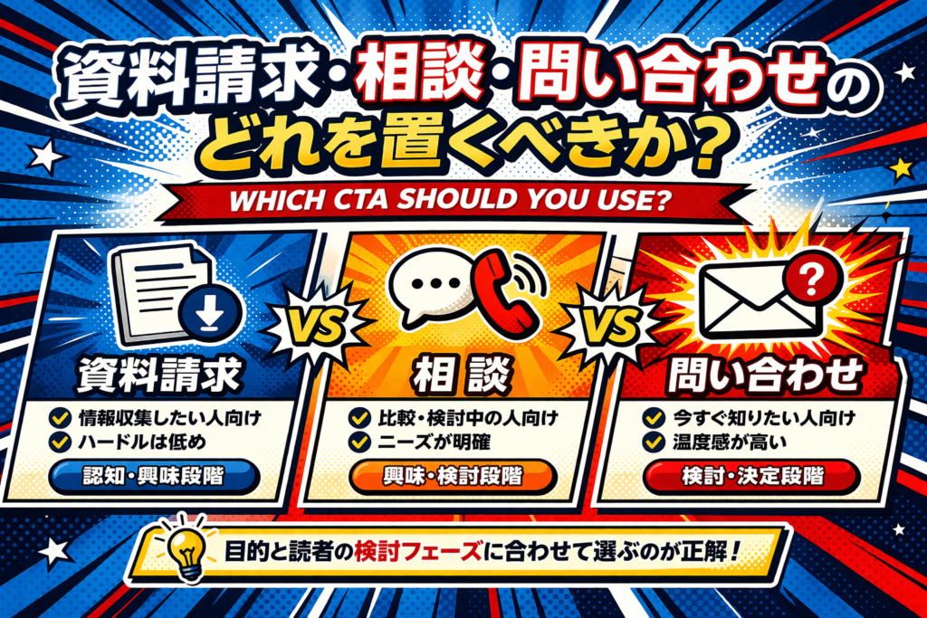比較記事やサービスページでは相談、流入記事では資料請求、共通窓口として問い合わせ、という使い分けから始めると整理しやすいです。